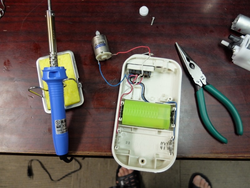 で、二つの野外水槽は3台の電池式のポータブルエアポンプを24時間交換のローテーションで使っているのですが、我が家の場合はほぼ1年ほどでモーターが止まってしまいます。メーカーの仕様書ではモーターの寿命は1000時間となっており、それを考えれば上出来なのですが、取りあえずモーターを交換すればもう少し使えるので交換します。